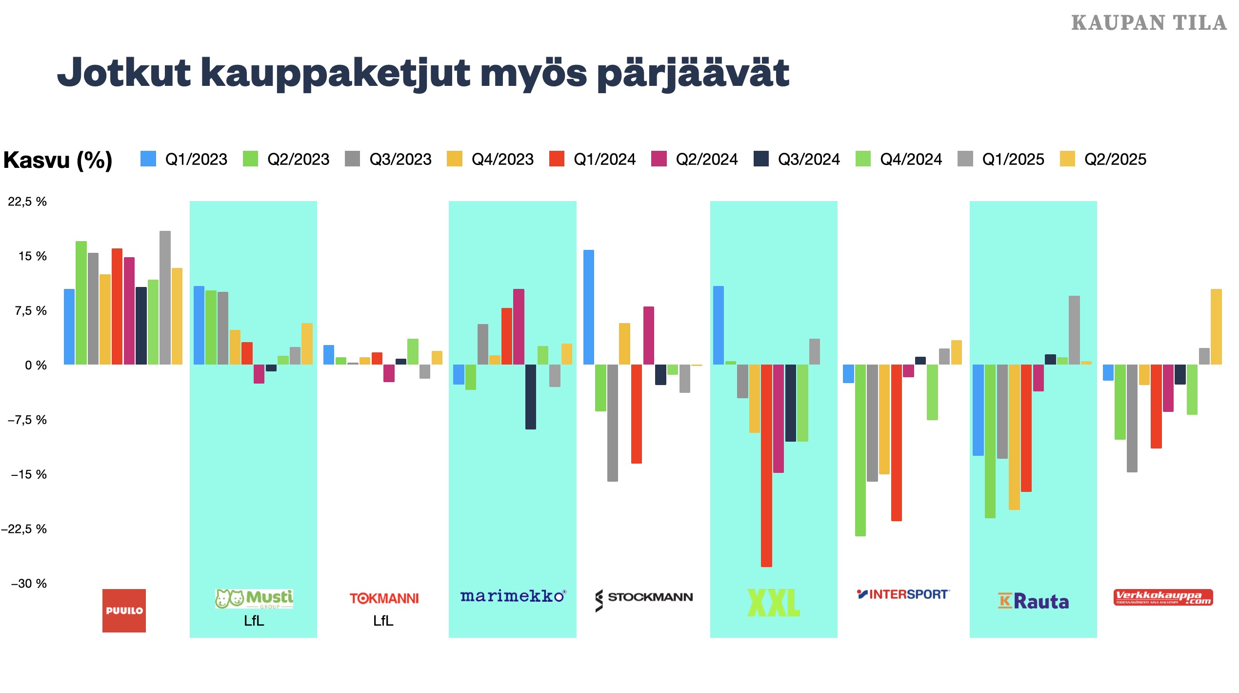Ruotsissa tilanne on jo toinen. Ruotsalaiset kaupan alan pörssiyhtiöt raportoivat vahvoja tuloksia laajalla rintamalla. Myös suomalaisista yrityksistä muun muassa Tokmanni ja Musti Group ovat kasvaneet Ruotsissa paremmin kuin Suomessa.