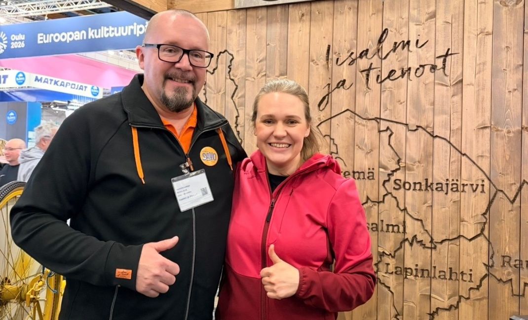 Kuvassa Iiden ry:n toiminnanjohtaja Miia Meronen ja Iiden ry:n alaisuudessa toimivaa Iisalmi ja tienoot -matkailuverkostoa luotsaava Jukka Vattukallio (vas.) Kuva on otettu vuoden 2026 Matkamessuilla Iisalmi ja tienoot -osastolla. Kuvaaja: Kirsi Piirainen