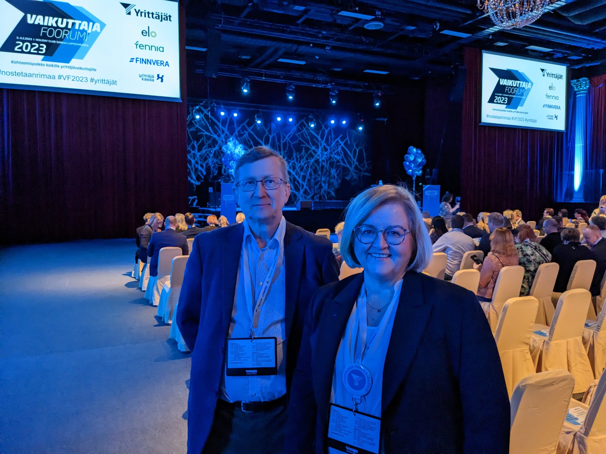 Yhteistyön syventäminen muiden elinkeinoelämän järjestöjen kanssa oli yksi keskeinen tavoite Erikoiskaupan liitolle. Edunvalvontajohtaja Jukka Ropponen ja Ulla Pöllänen Suomen Yrittäjien vaikuttajafoorumissa 2023. Kuva: Markus Kalmi.