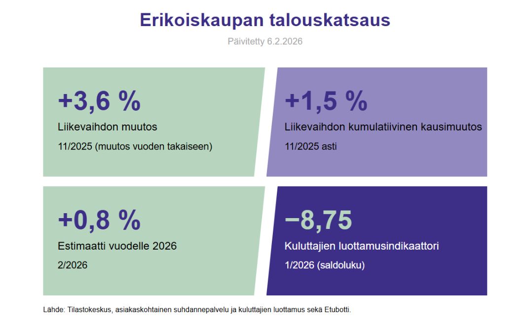 Erikoiskaupan liiton tilastopalvelun ETUBot-ennustetyökalu arvioi erikoiskaupan yritysten liikevaihdon kasvavan vuonna 2026 noin 0,8 prosenttia. Hyvä marraskuu 2025 vahvistaa odotuksia siitä, että myös joulukaupasta muodostui positiivinen.