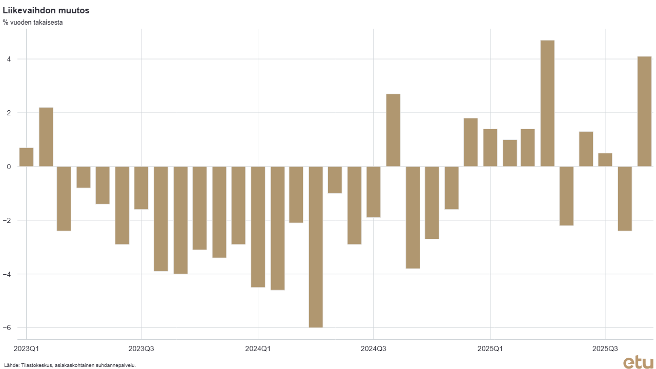 Erikoiskaupan liitto ETU ry:n tilastojen mukaan erikoiskaupan liikevaihto kasvoi syyskuussa 4,1 prosenttia verrattuna vuoden takaiseen. Liiton tilastopalvelun ennustetyökalu ETUBot ennakoi hyvän syyskuun perusteella nyt koko vuodelle 1,1 prosentin kasvua koko erikoiskaupan liikevaihtoon.