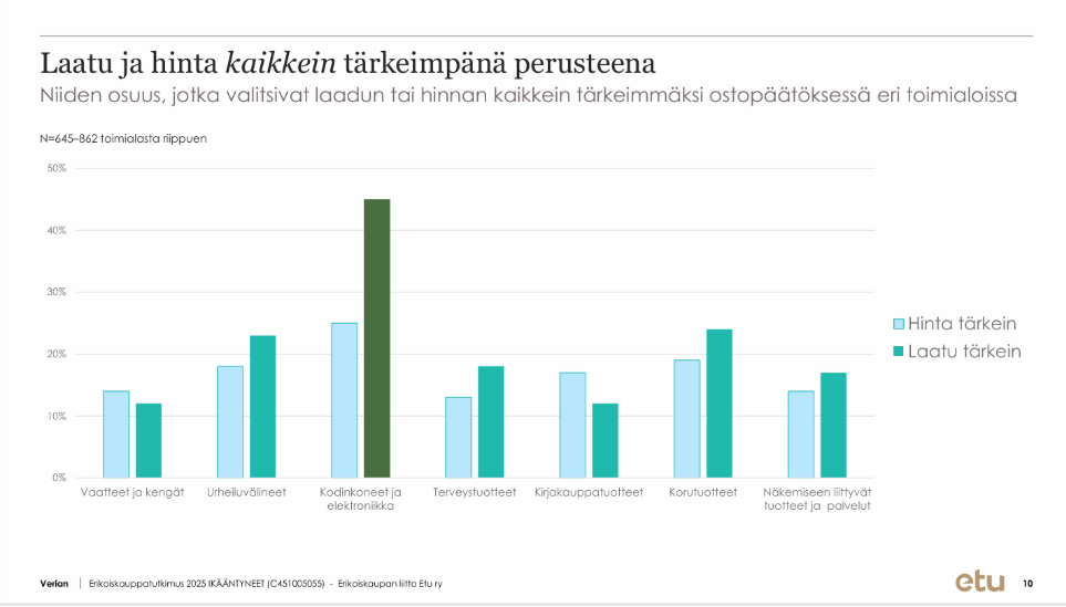 Kuva 1: Kodinkoneiden ja elektroniikan ostospäätöksessä hinta ja erityisesti laatu ratkaisevat muita tuoteryhmiä enemmän.