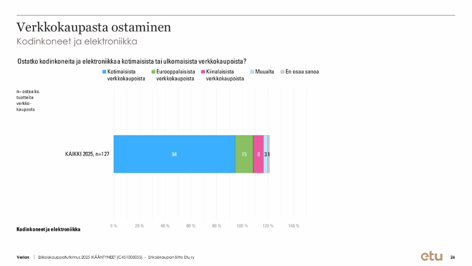 Kuluttajatutkimuksen verkkokauppaa koskevaan kysymykseen vastanneista selkeä enemmistö kertoi ostavansa kodinkoneita ja elektroniikkaa kotimaisista verkkokaupoista. Lähes 75 prosenttia vastaajista kertoi käyttävänsä Suomessa toimivia erikoiskaupan verkkokauppoja. Vain reilu kuusi prosenttia yli 55-vuotiaista kuluttajista kertoi hankkivansa kodinkoneita ja elektroniikkaa kiinalaisista verkkokaupoista.