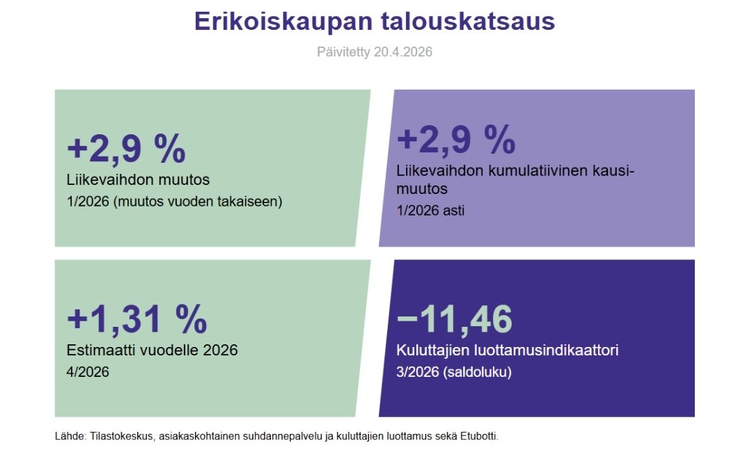 Erikoiskaupan talouskatsaus esittää keskeiset avainluvut.